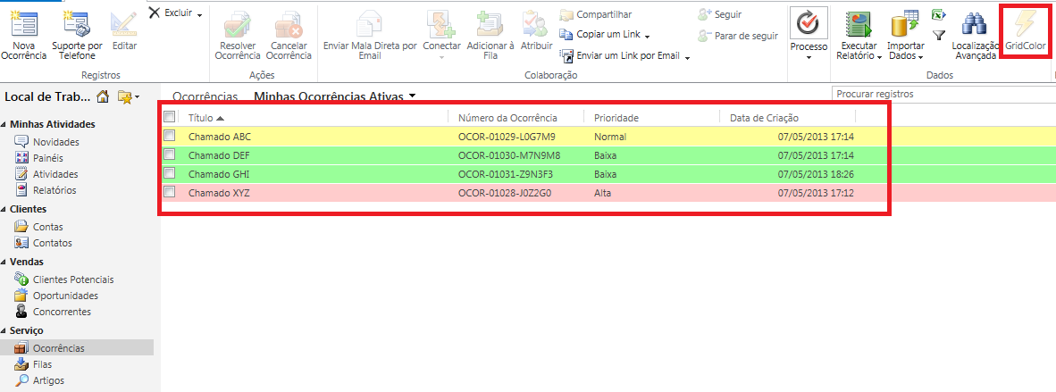 No exemplo que estamos compartilhando, estou pesquisando a coluna “Prioridade” da entidade “Ocorrência” verificando os valores informados: Alta, Normal e Baixa. Cada valor da prioridade representará a cor da linha no grid.