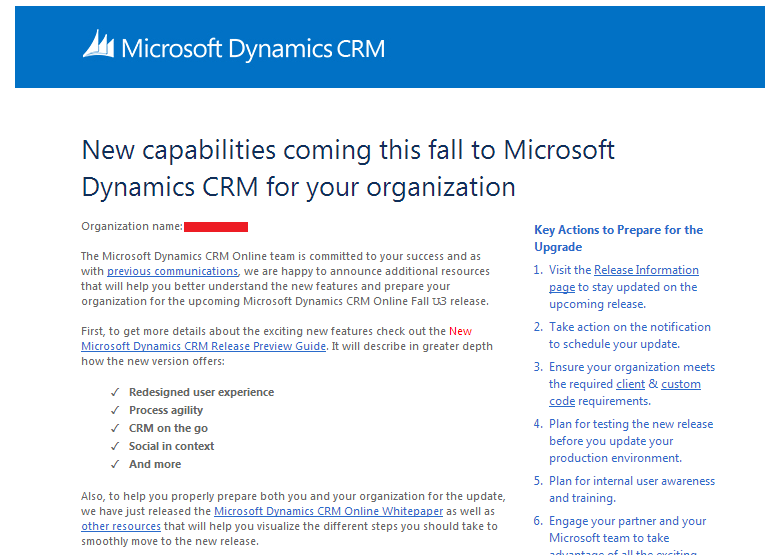 Desta vez, temos algo bem mais maduro e com maior nível de detalhes, white papper (How to Prepare for the Microsoft Dynamics CRM Online Fall ’13 Service Update) com diversas informações foi divulgado para administradores dos CRM’s Online.