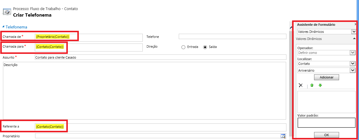 Abaixo um exemplo de fluxo de trabalho criado na entidade de contatos:
