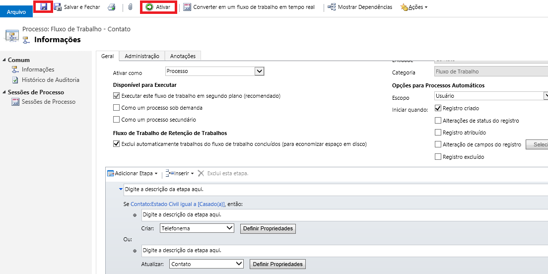 Bom, agora podemos “Salvar” e depois “Ativar” nosso fluxo de trabalho, da forma que ficou, ele funcionará apenas na criação de novo contatos e iniciará automaticamente em segundo plano, porém só será executado quando o usuário que estiver criando o contato for o mesmo que criou o fluxo.