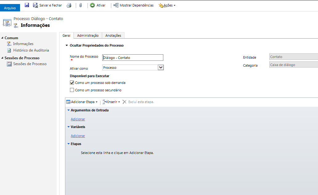 Ao contrário dos fluxos de trabalho, a quantidade de campos disponibilizados é muito inferior, o nosso foco deve ficar no corpo do processo, nos Argumentos de Entrada, Variáveis e Etapas.