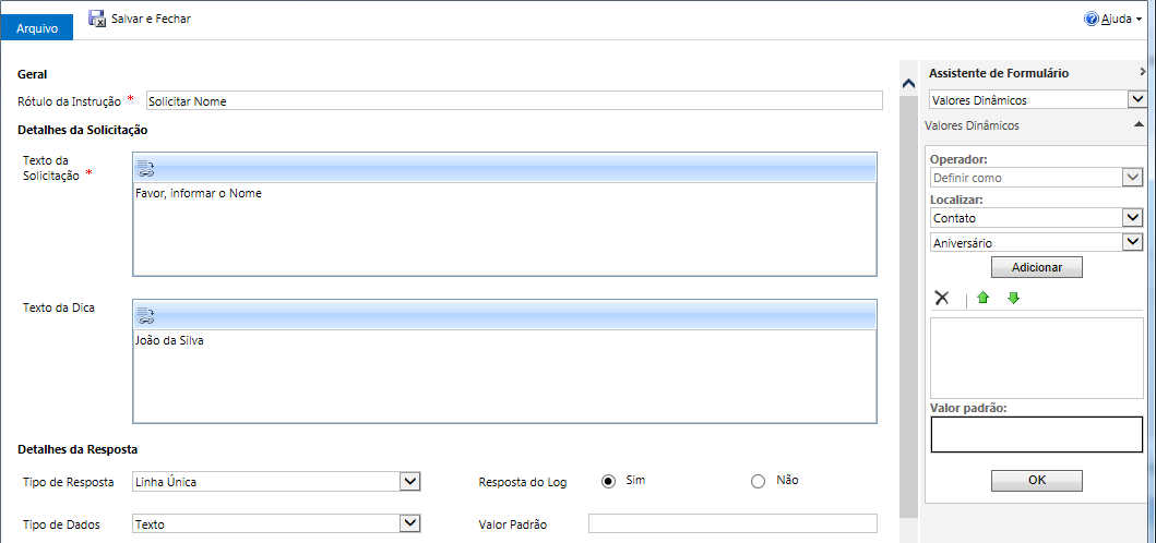 Pronto, com isso chegamos ao final da demonstração. Vale lembrar que podemos executar os diálogos automaticamente ao abrir o formulário fazendo uso de um pouco de JScript, bem como podemos ter regras de encadeamento complexas, várias páginas e outros tipos de campos que não demonstrei aqui, mas é só uma base para iniciarmos a utilização.