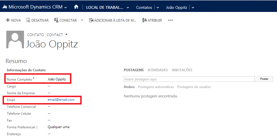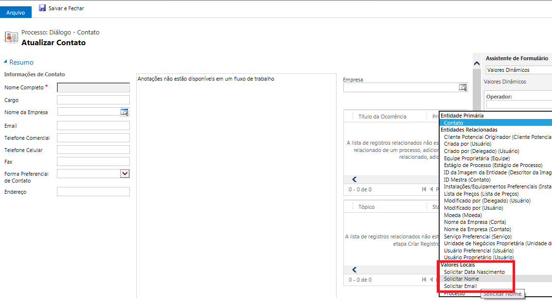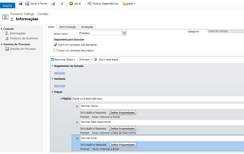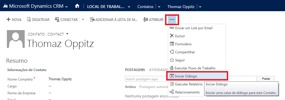 Após realizarmos o “de para”, nosso trabalho está concluído, podemos publicar (Ativar) o processo e navegar até um registro da entidade Contato e executarmos o diálogo: