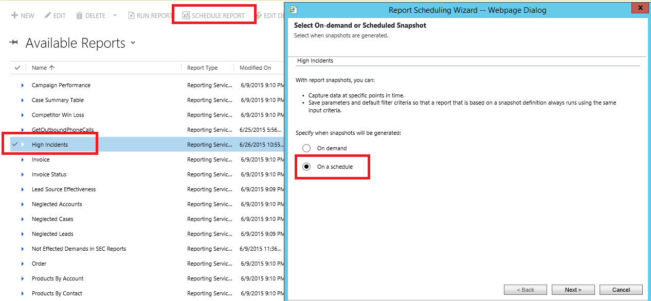 Algo que existe (pela minha memória) desde a versão 4 do CRM OnPremises é a possibilidade de agendar a execução de relatórios!