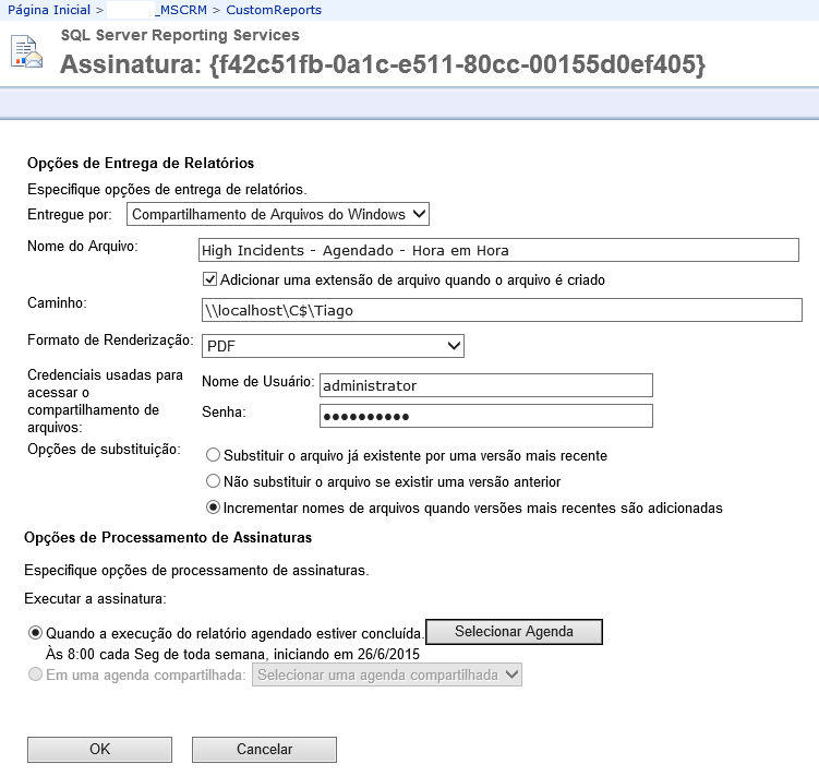 Com o agendamento concluído, teremos que abrir o servidor que contém o Reporting Services para fazer a etapa que grava o arquivo em disco.