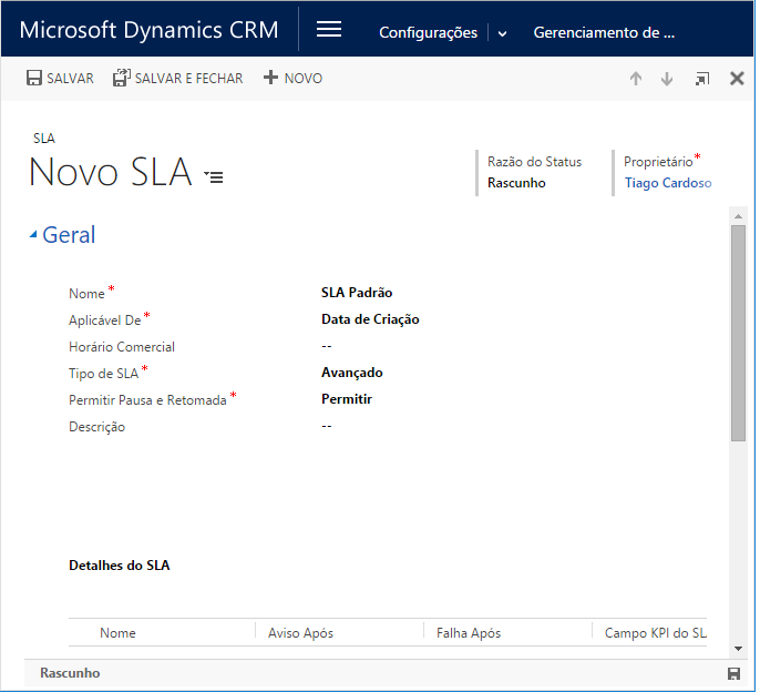 Precisamos navegar em Configurações > Gerenciamento de Serviços > Contratos de Nível de Serviço > Clicar em Novo e preencher o formulário: