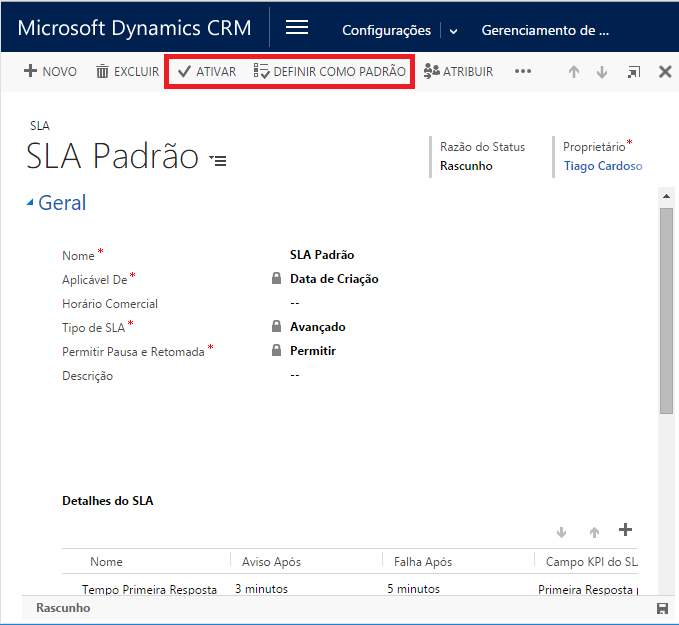 Pronto! Itens de SLA e SLA criados! Devemos agora “Ativar” e “Definir como Padrão” (pois este SLA será o SLA genérico):