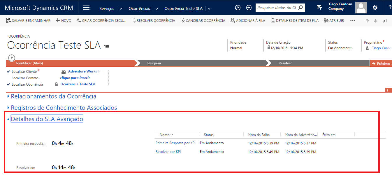 Agora, toda vez que uma ocorrência for criada automaticamente o SLA iniciará! Para visualizar expanda a guia Detalhes do SLA Avançado: