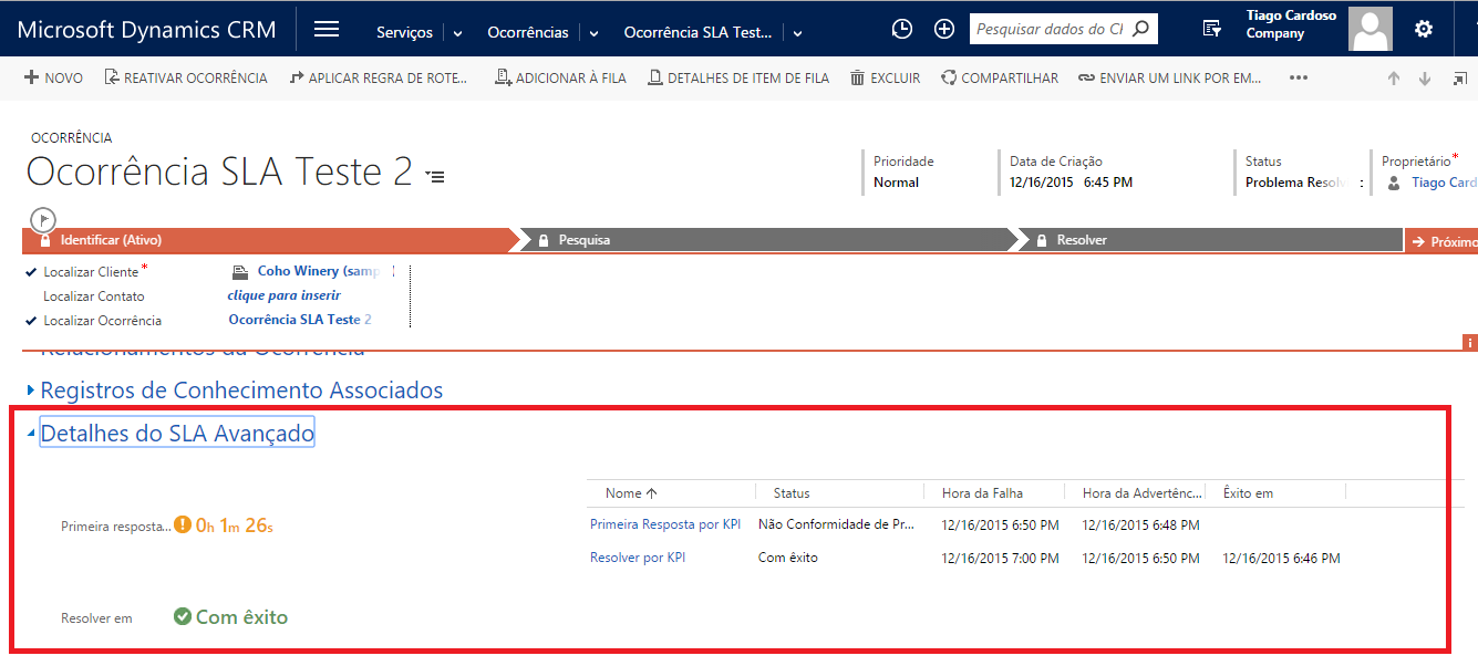 Quando finalizamos a ocorrência em tempo hábil, teremos o indicador “Resolver em” com o valor “Com êxito”. (Lembre-se de recarregar o formulário após Resolver a Ocorrência):