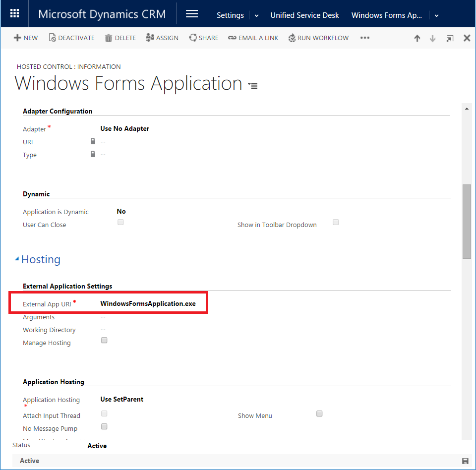 - External App URI = Caminho físico do aplicativo externo ou podemos criar uma cópia do aplicativo e inseri-la na pasta raiz do USD (C:\Program Files\Microsoft Dynamics CRM USD\USD). Neste exemplo eu preferi, incluir a aplicação dentro da pasta USD, por isso não coloquei nada além do nome do executável!