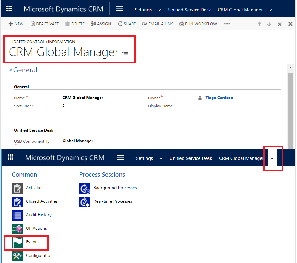 Bom agora será necessário informar qual página e criar um gatilho para abrir a página. Abra o hosted control já existente “CRM Global Manager”, depois expanda seus relacionamentos e clique em “Events”: