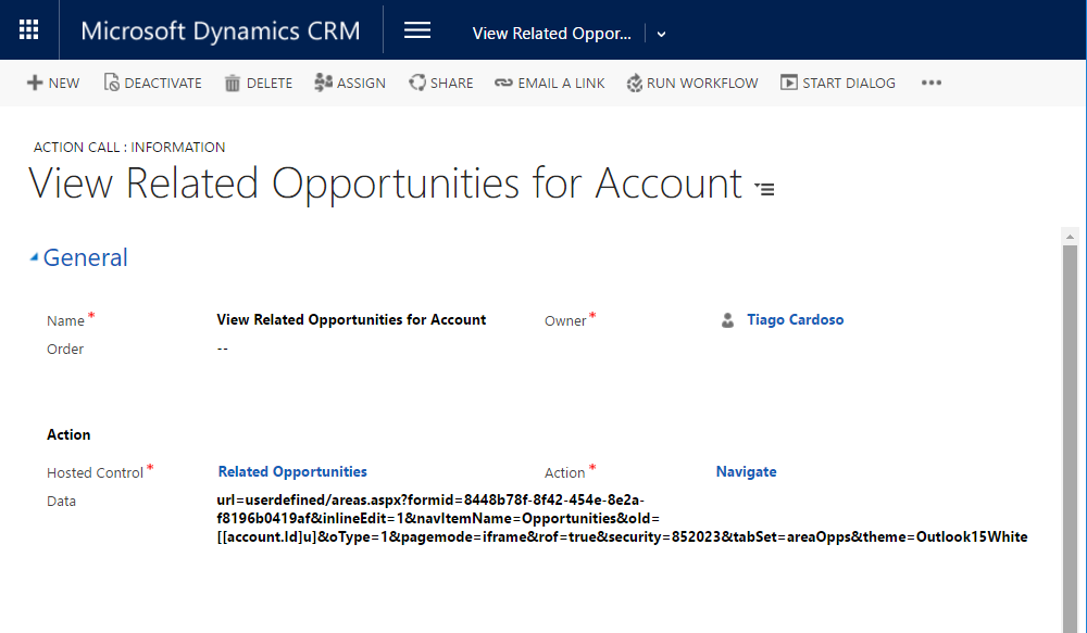 - Data – “url=userdefined/areas.aspx?formid=8448b78f-8f42-454e-8e2a-f8196b0419af&inlineEdit=1&navItemName=Opportunities&oId=[[account.Id]u]&oType=1&pagemode=iframe&rof=true&security=852023&tabSet=areaOpps&theme=Outlook15White”, a URL da visualização das Oportunidades relacionadas ao Cliente atual