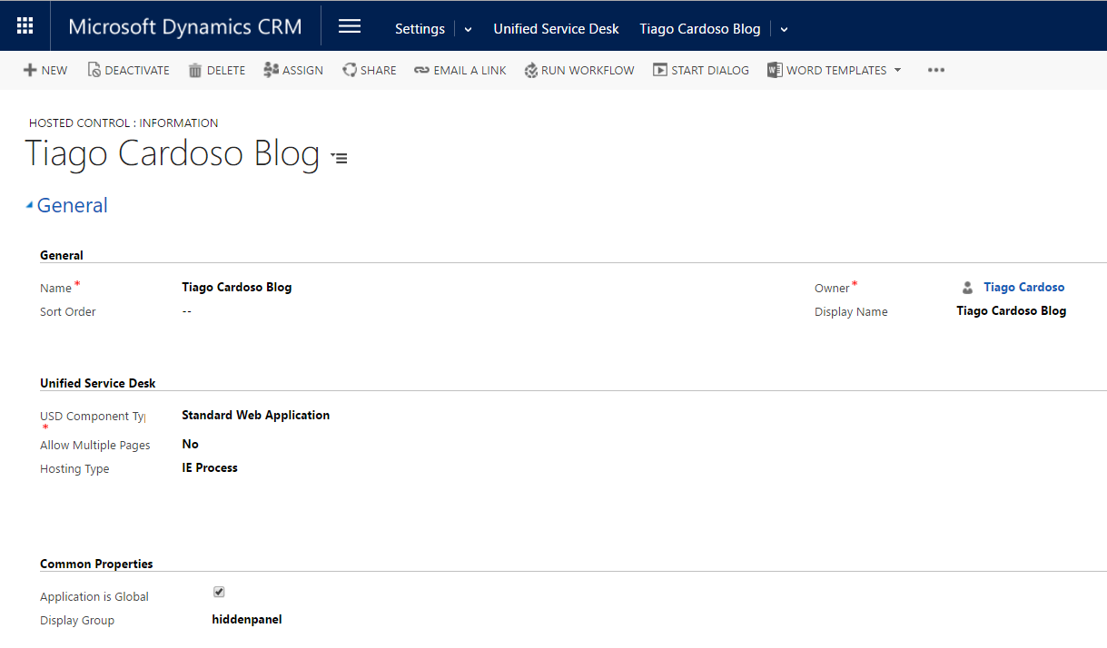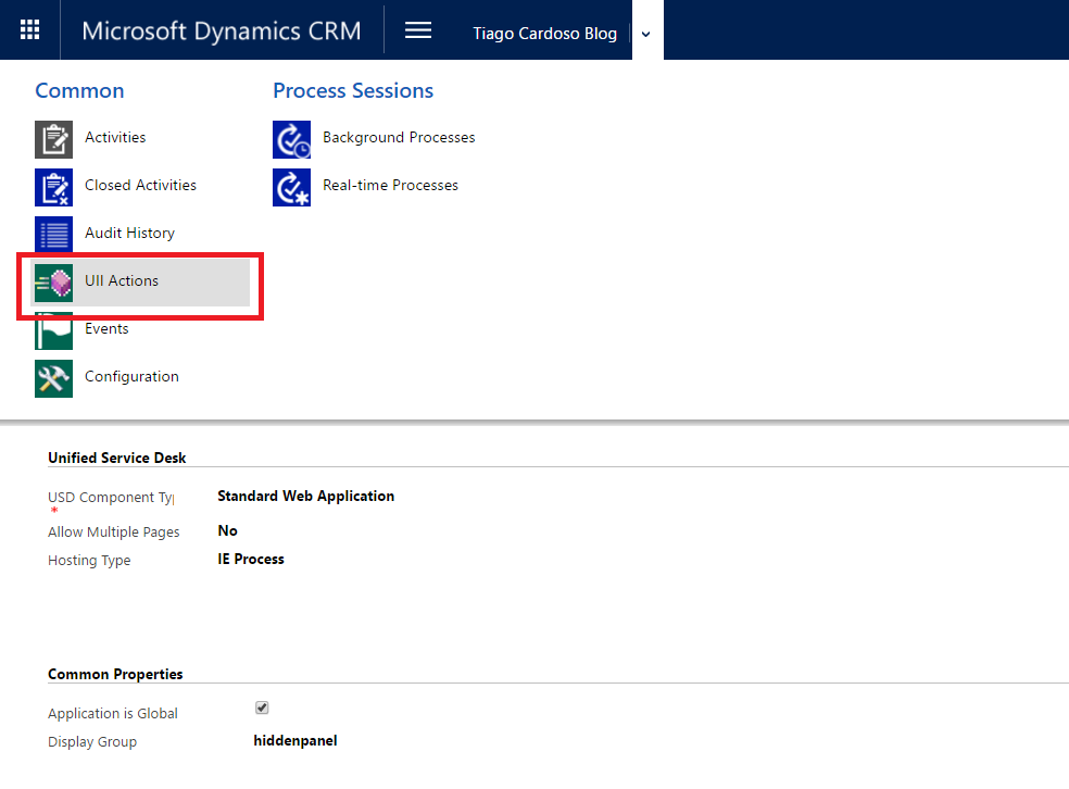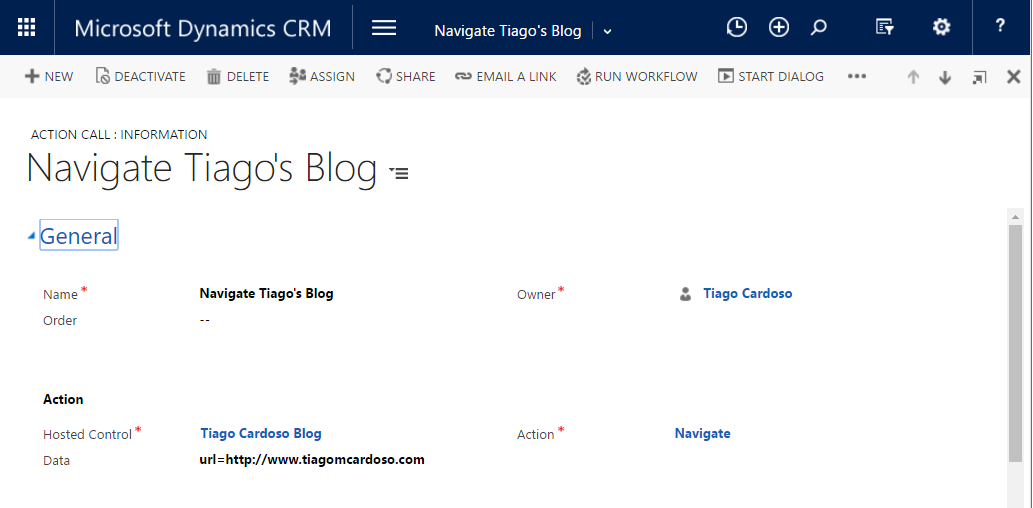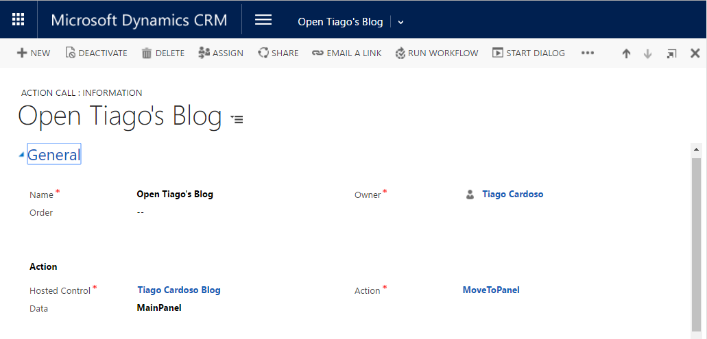 Este exemplo, consiste na criação de um Hosted Control do tipo “Standard Web Application”, duas UII Actions para possibilitar ao hosted control as ações de “Navigate” e “MoveToPanel”, um botão “Tiago’s Blog” no Toolbar “Main” e duas Action Calls para fazer a abertura e consulta da Página Web.