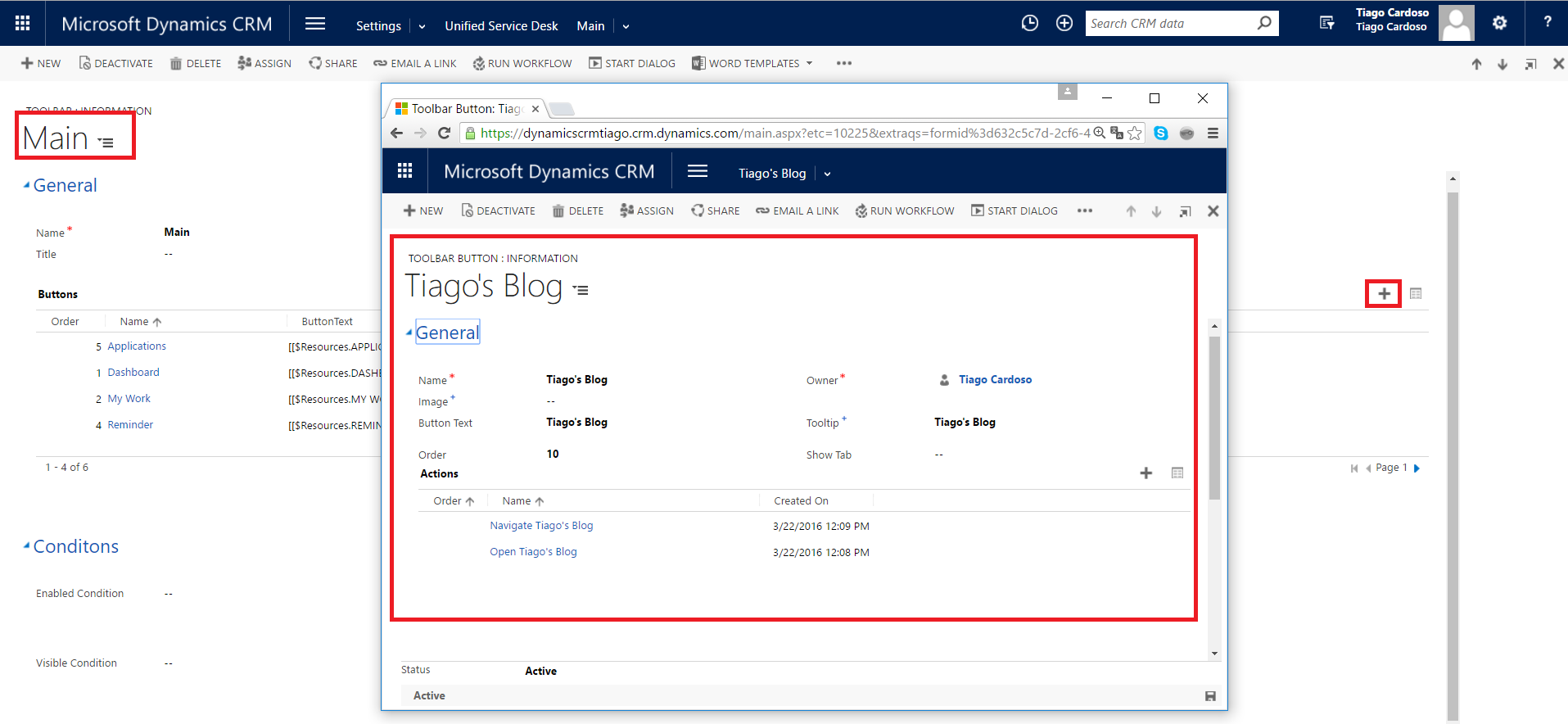 Agora vamos criar o botão, navegue em Configurações > Unified Service Desk > Toolbars > Abra a “Main” > Clique em Adicionar um “Novo Botão”: