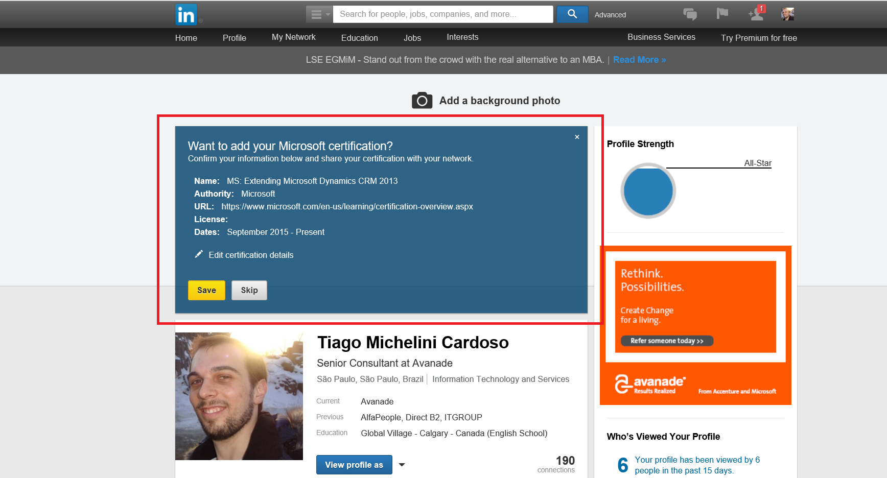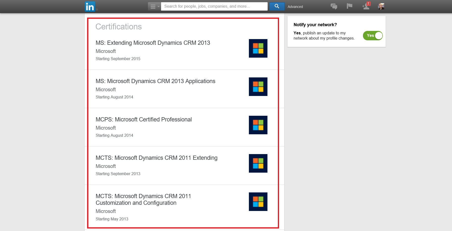 Ao final, teremos nossas certificações MS adicionadas no LinkedIn (Ué cadê o CRM 2015 e 2016 ai?!!! rsrsrs Vamos lá…):
