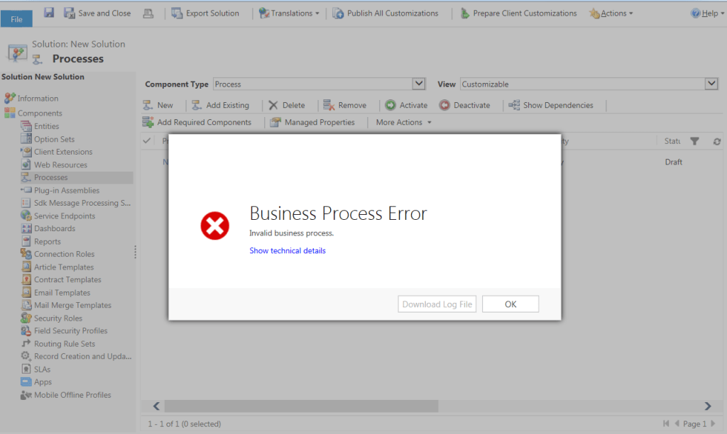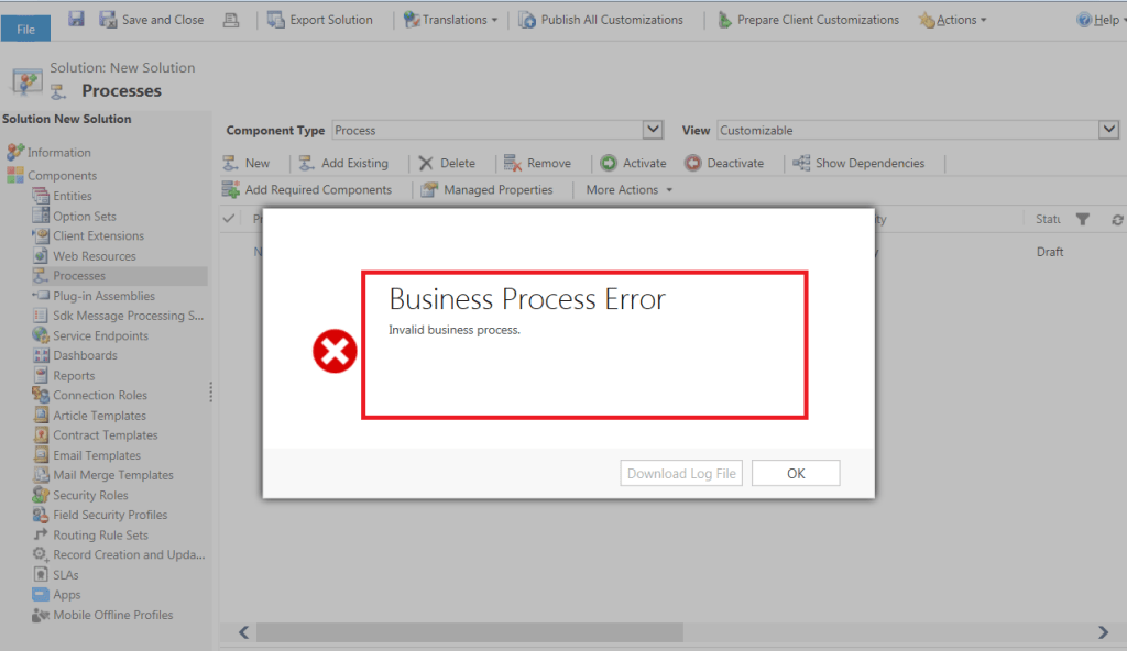 Após um pouco de troubleshooting, meu colega de trabalho Justin Marshall, encontrou o problema. Processos de negócio (Business Process Flows) não publicados, em “Rascunho” (Draft) impedem que a solução seja exportada.