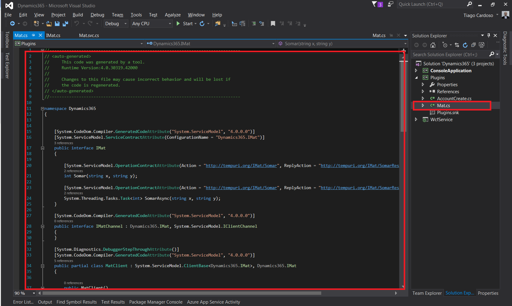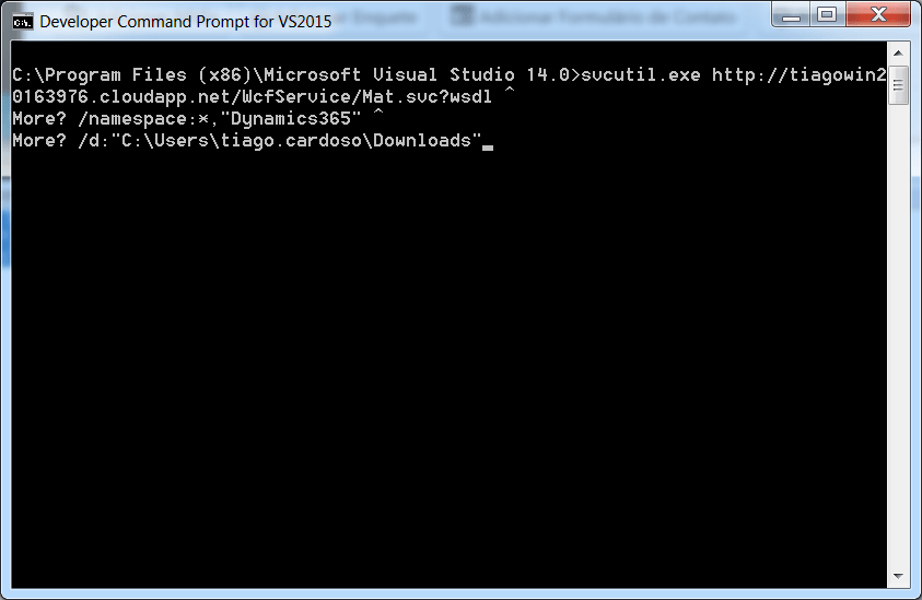 svcutil.exe http://tiagowin20163976.cloudapp.net/WcfService/Mat.svc?wsdl ^ /namespace:*,"Dynamics365" ^ /d:"C:\Users\tiago.cardoso\Downloads"