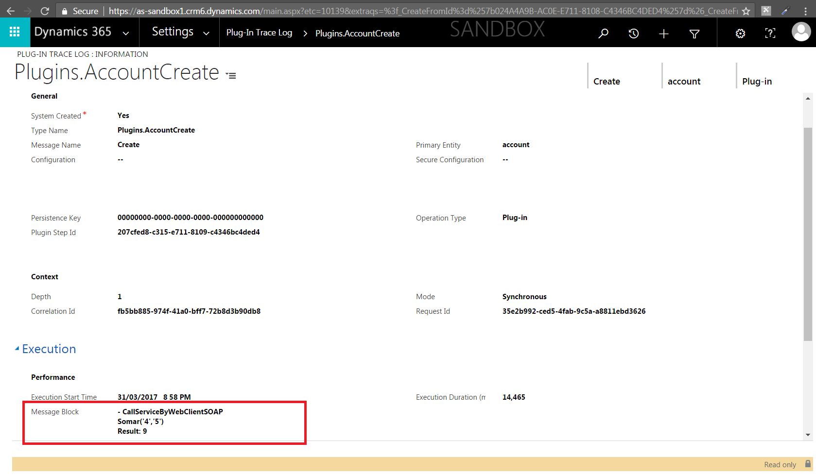 Assim, ao criar uma conta no CRM, quando observamos o log de execução do plugin, vemos: