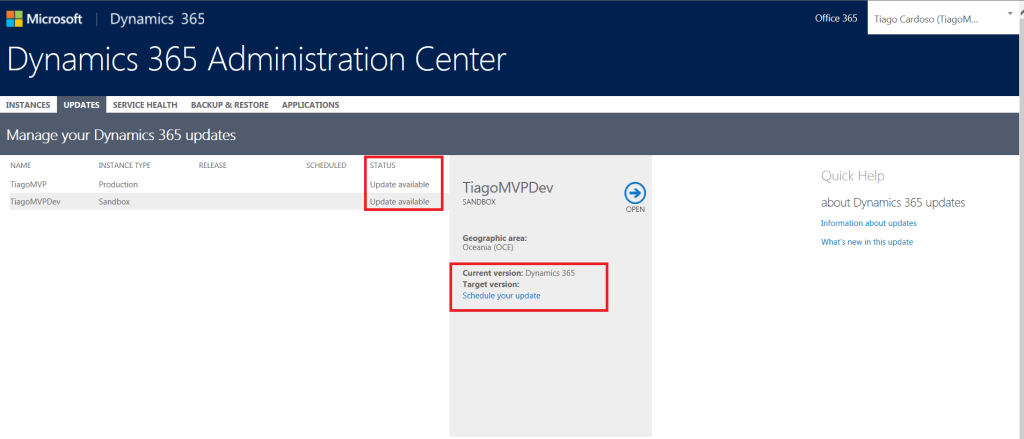 Ao abrir a área administrativa do Dynamics no Portal Office, navegue até a aba “Atualizações” (Updates), veja se sua organização está apta para a atualização através da coluna “Status”, se sim, clique em “Agendar sua atualização” (Schedule your update):