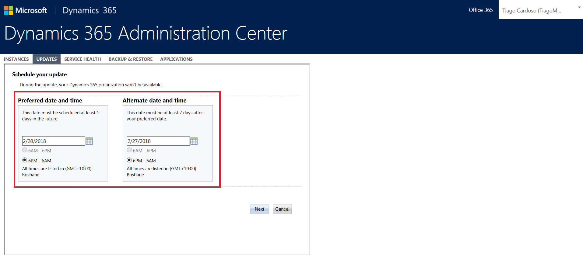 A primeira data disponível para que o upgrade ser ativado é dia 20/02/2018, além disso, podemos configurar uma data alternativa, como já era possível nos últimos releases.