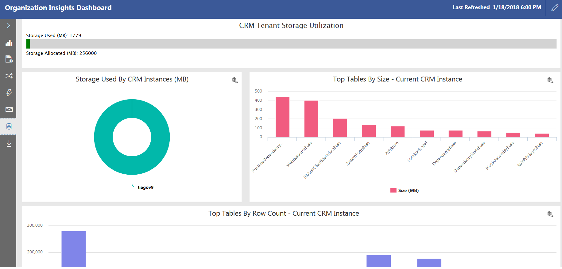 - Armazenamento (Storage) – esta área é uma das melhores na minha opinião, conseguimos visualizar o espaço físico utilizado por nossa organização, chegando ao nível das entidades e quantidade de linhas nas tabelas do banco de dados. Acredito que com poucas melhorias, como poder visualizar todas as entidades ao invés das top 10 seria de grande valia