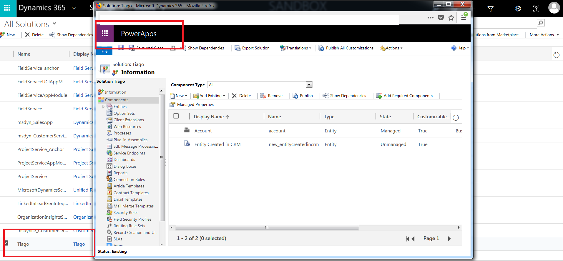 Bom se você está utilizando Dynamics Online em uma versão igual o superior a 9.0, você já usando o CDS e não sabia! Assim, todas entidades e atributos do CRM (Customer Engagement) estão expostos para o PowerApps! Quando abrimos uma solução, veja quem já aparece:
