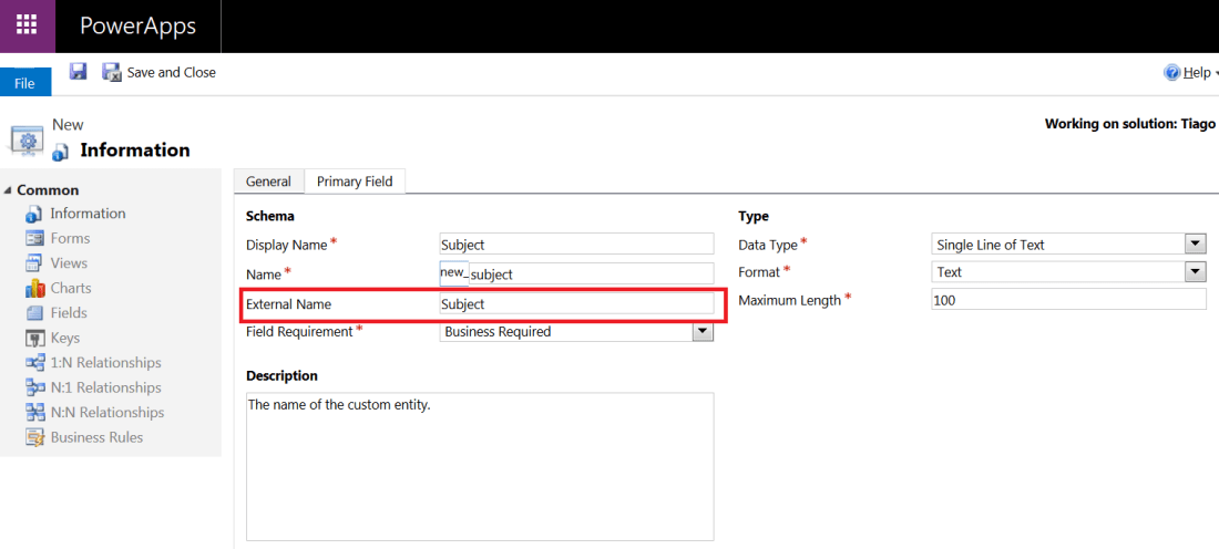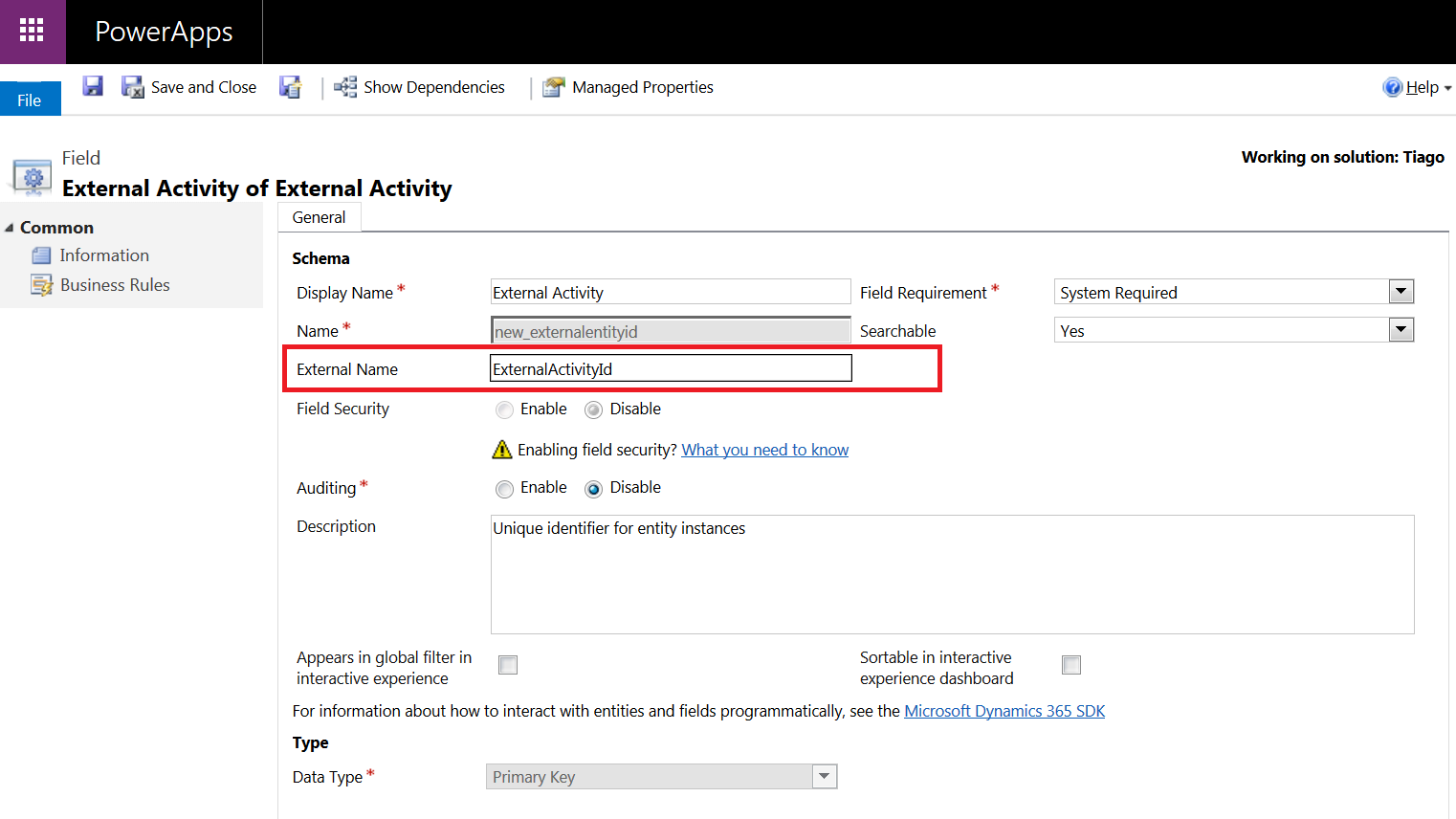 Agora é a vez de informar o External Name da chave primária (new_ExternalActivityId) da entidade virtual: