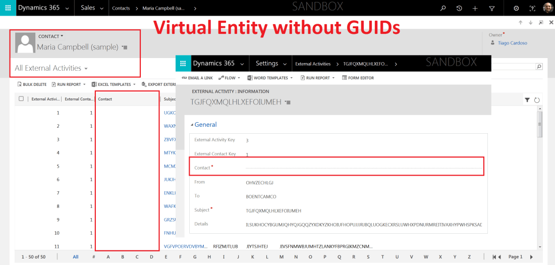 Antes de iniciar a falar do código, preciso dar um pouco de contexto. Assim como nos posts anteriores, continue utilizando um relacionamento entre Contato (contact) e uma entidade virtual chamada External Activity (new_externalentity). Deste modo, embora eu tenha sido obrigado a fazer um relacionamento de 1:N (1 contato > N external activities), o serviço externo não respeita/entende o que é um contactid, mas sim um atributo que criei chamado “External Activity Key” (new_externalactivitykey), este atributo é a chave de negócios única que relaciona as duas entidades.
