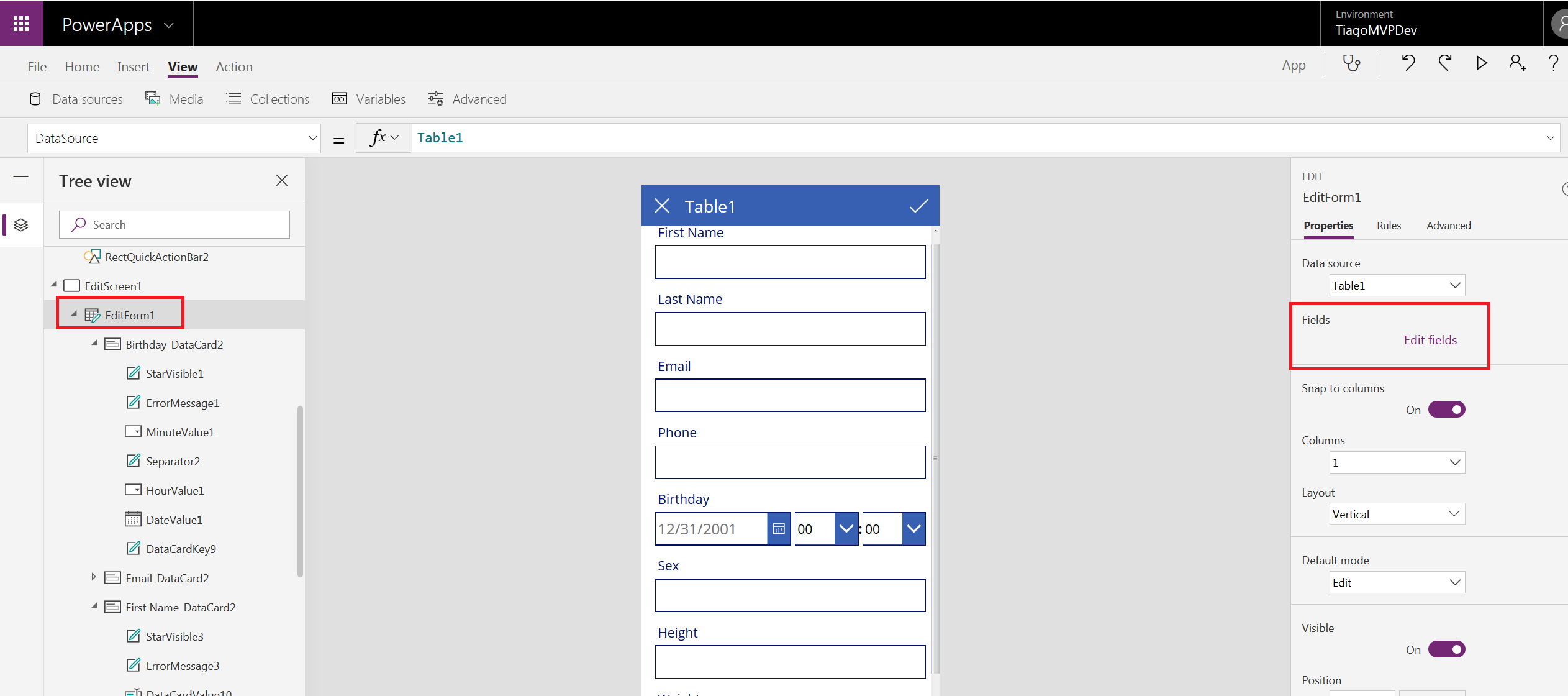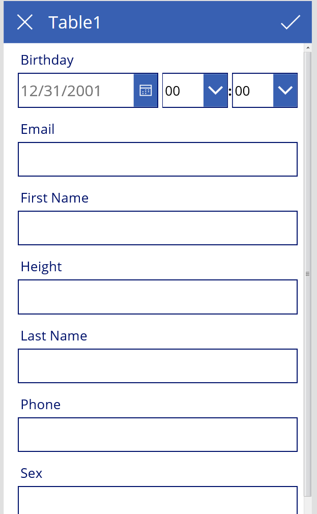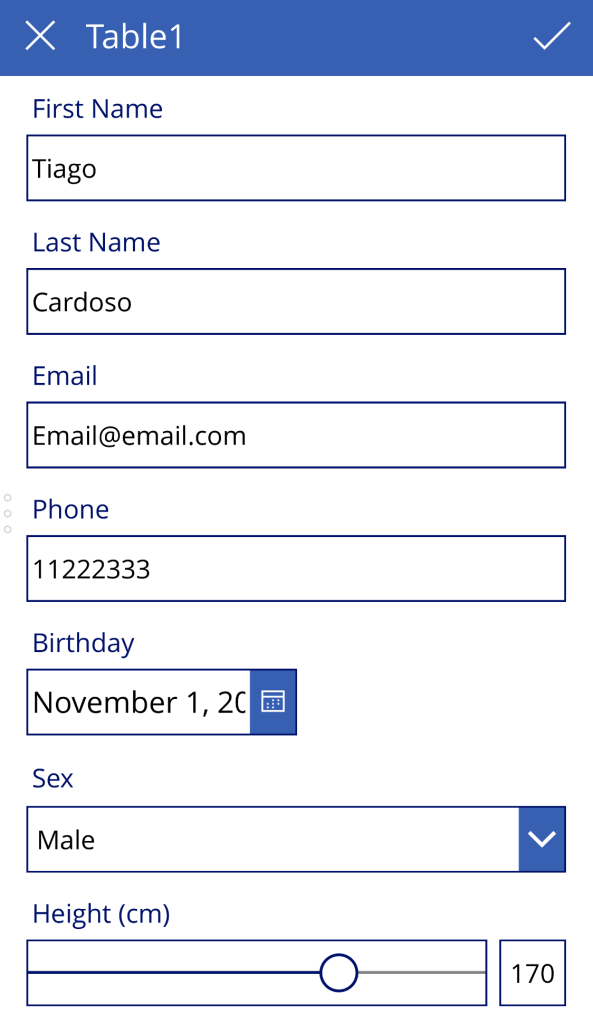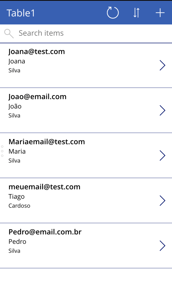 Como eu havia dito, o PowerApps automaticamente adiciona todos os campos da planilha Excel em nossa app, para pre-visualizar, pressione F5 e depois clique no “+” no canto superior: