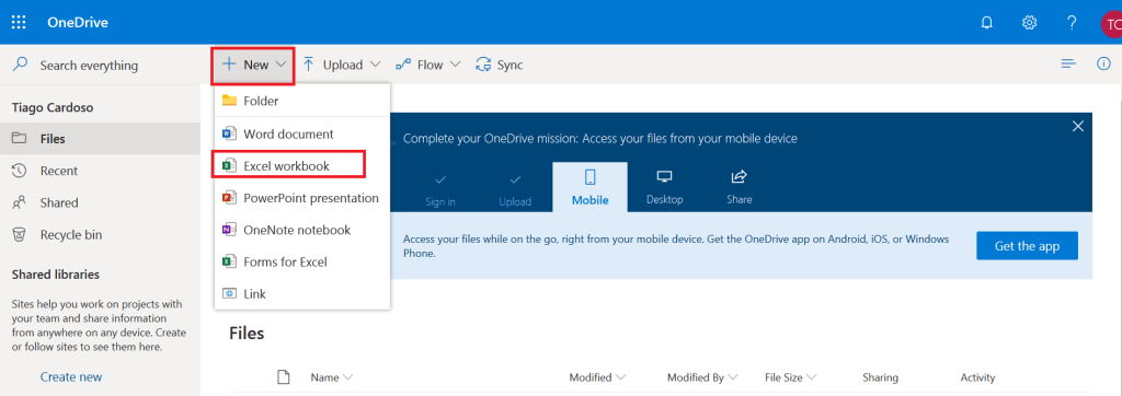 Em seu OneDrive ou OneDrive for Business, criei uma nova planilha Excel:
