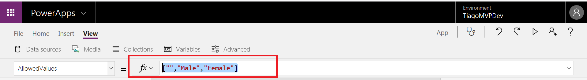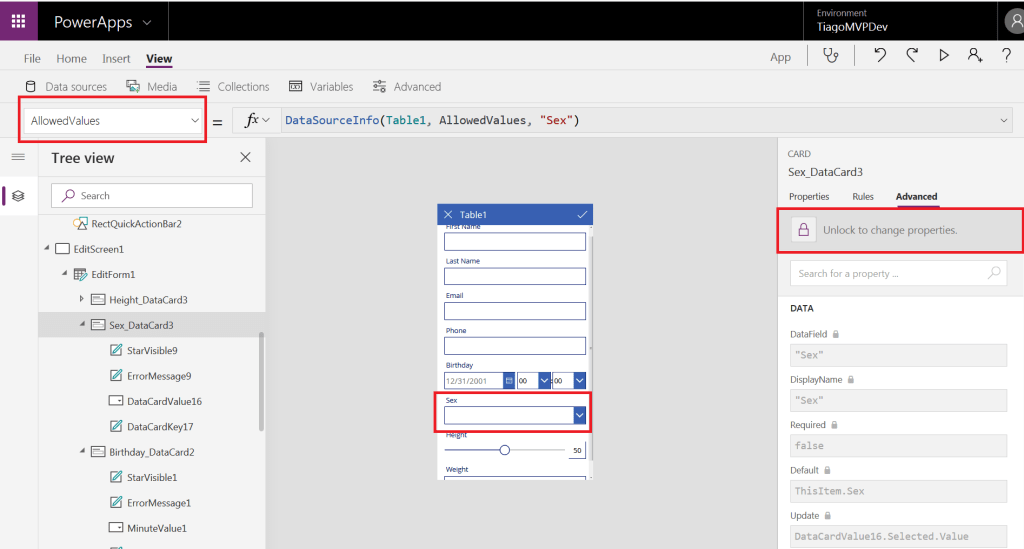 - Depois precisamos criar as possíveis opções, clique no campo sexo, selecione a aba avançado (advanced), desbloquei o campo, ao lado na área em que podemos incluir fórmulas existe um combo, troque para valores permitidos (allowed values):