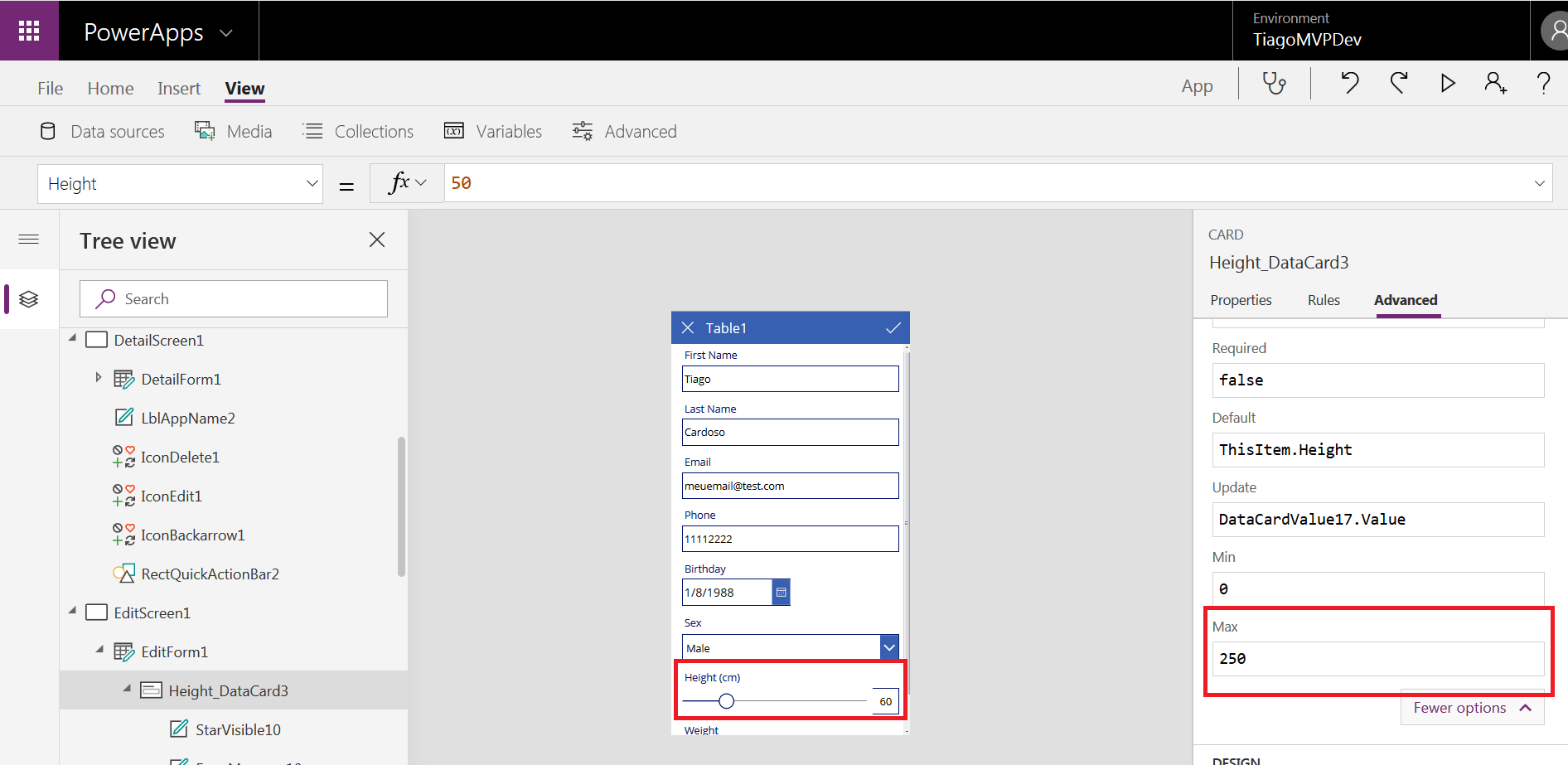 - Altura (height) troque para slider, depois aumente o valor máximo para “250” (não esqueça de debloquear o campo):