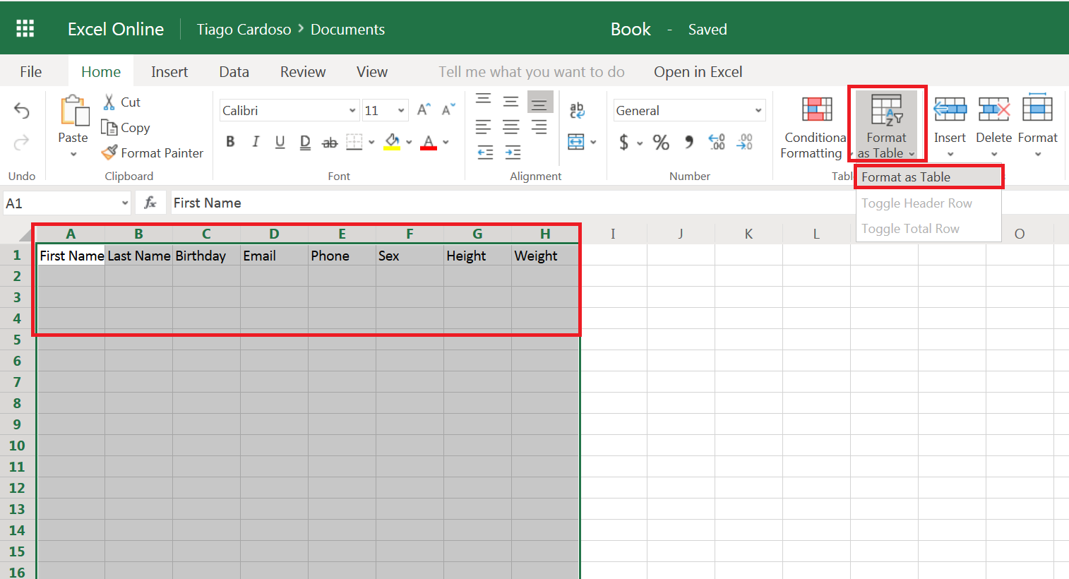 Adicionei os campos (colunas) que sua app terá e clique em formatar como uma tabela (Format as Table):