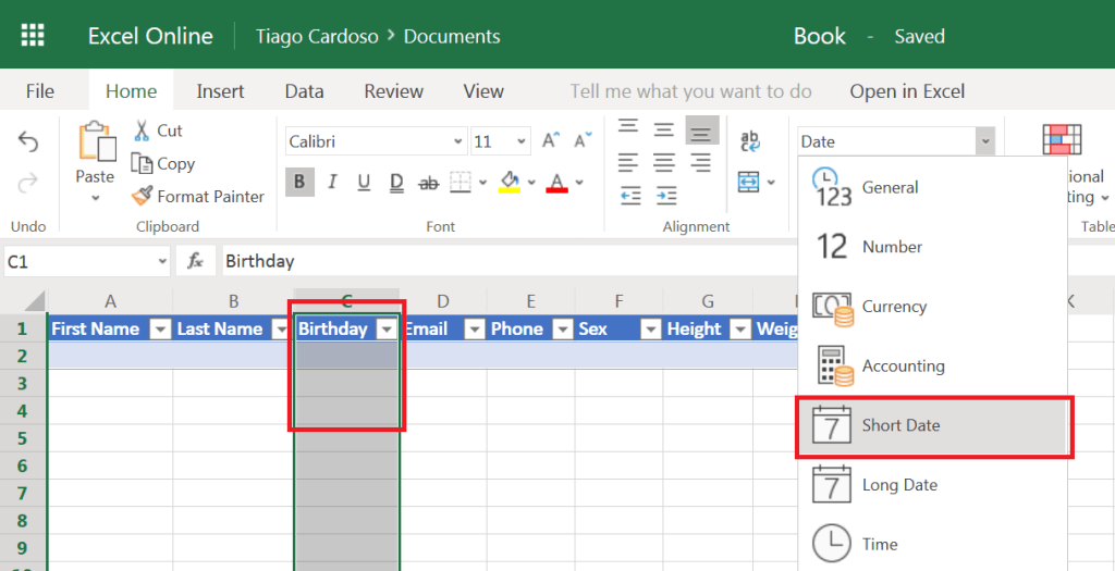 Agora formate o tipo de dado de cada coluna, por exemplo data de nascimento (birthday) é do tipo data curta (short date):