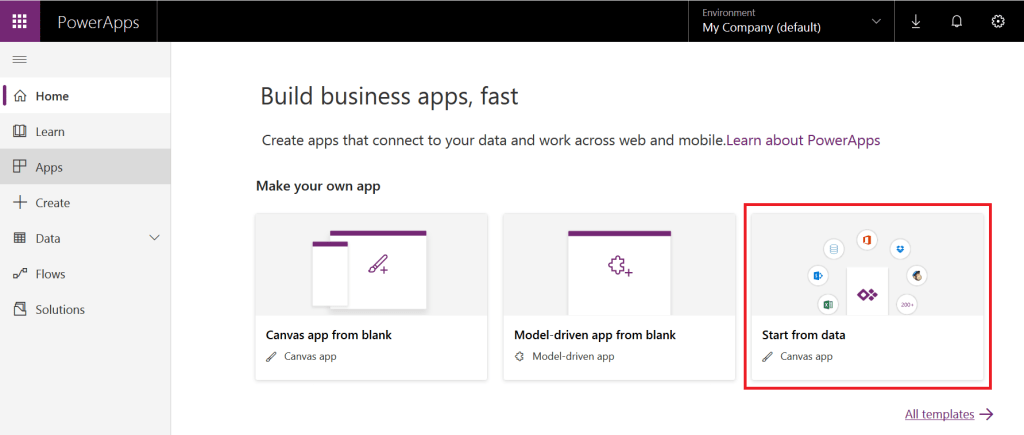 Planilha pronta, vamos criar nossa app! Em seu navegador, vá em https://make.powerapps.com/ e clique em iniciar a criação de uma app em Canvas através de dados (Start from data):