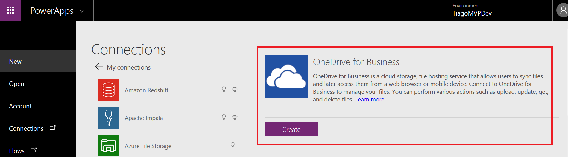 Clique em adicionar nova conexão (new connection), selecione OneDrive/OneDrive for Business, depois clique em criar (create) e fazer o sign in: