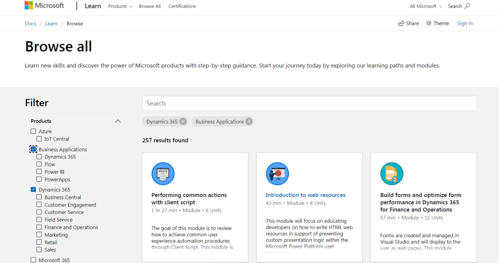 • Microsoft Learn – possui um formato bem semelhante aos cursos oferecidos pela edX, onde temos textos, imagens, vídeos e um teste final para avaliar nosso conhecimento. A única diferença trata-se do conteúdo não ser 100% relacionado com o que os exames irão necessitar, pois a ideia aqui é ganhar o conhecimento em uma área específica do Dynamics, como pequenos blocos em que vamos criando em nossas cabeças!
