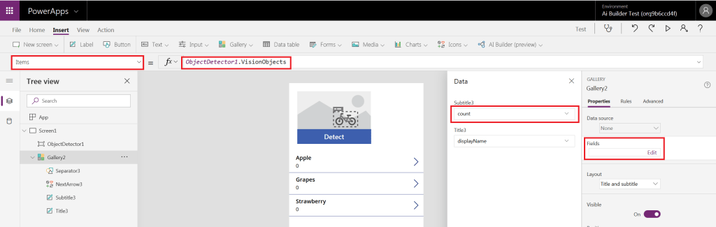 Agora temos que informar qual a fonte de dados a galeria irá utilizar, para isso selecione a galeria, depois na barra de comando selecione Items (itens) e troque o valor para ObjectDetector1.VisionObjects. Em seguida, no menu lateral direito, clique em Edit (editar), logo abaixo do atributo Fields (campos), modifique o Subtitle (subtítulo) para Count (contar):