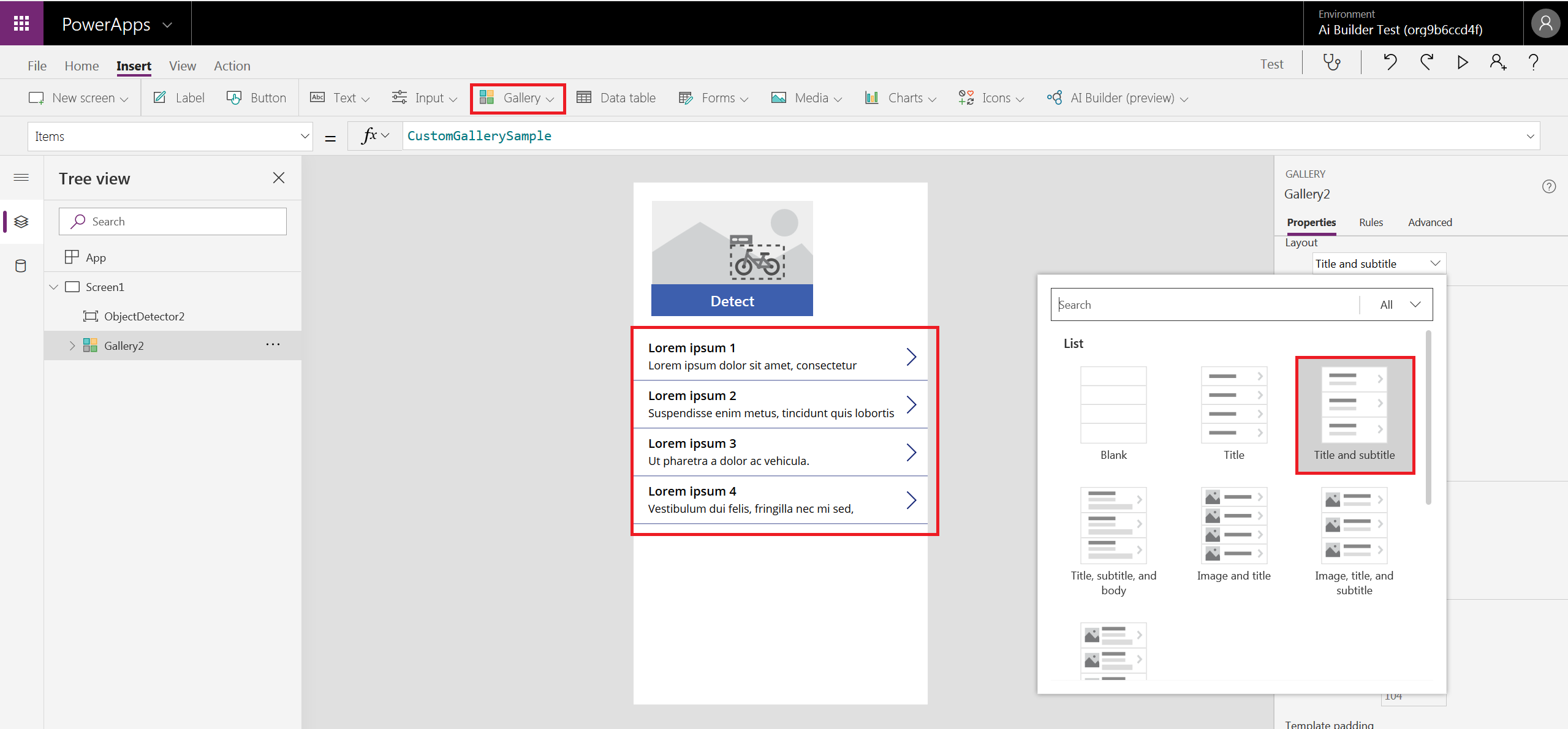 Nesse exemplo irei um pouco além de apenas adicionar o componente de detecção. Vamos adicionar os objetos detectados em uma Galeria (gallery). Para isso adicione a galeria na app e troque o layout para Title and Subtitle (título e subtítulo):