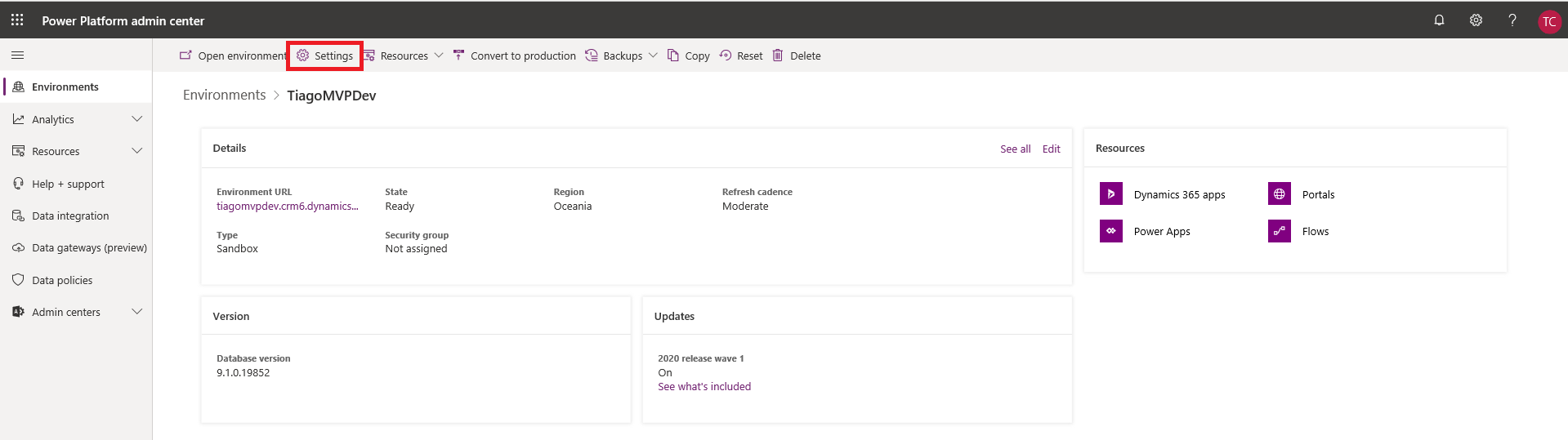 Para habilitar o acesso, vá até admin.powerplatform.microsoft.com e selecione o ambiente (environment) que irá fazer a modificação, depois clique em Settings:
