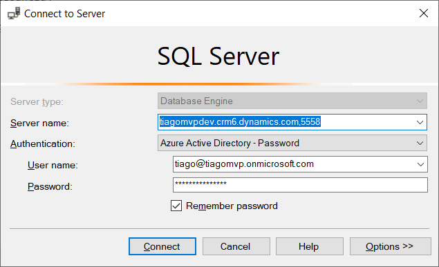 - Server Name: SUA_ORGANIZACAO.crmREGIAO.dynamics.com,5558