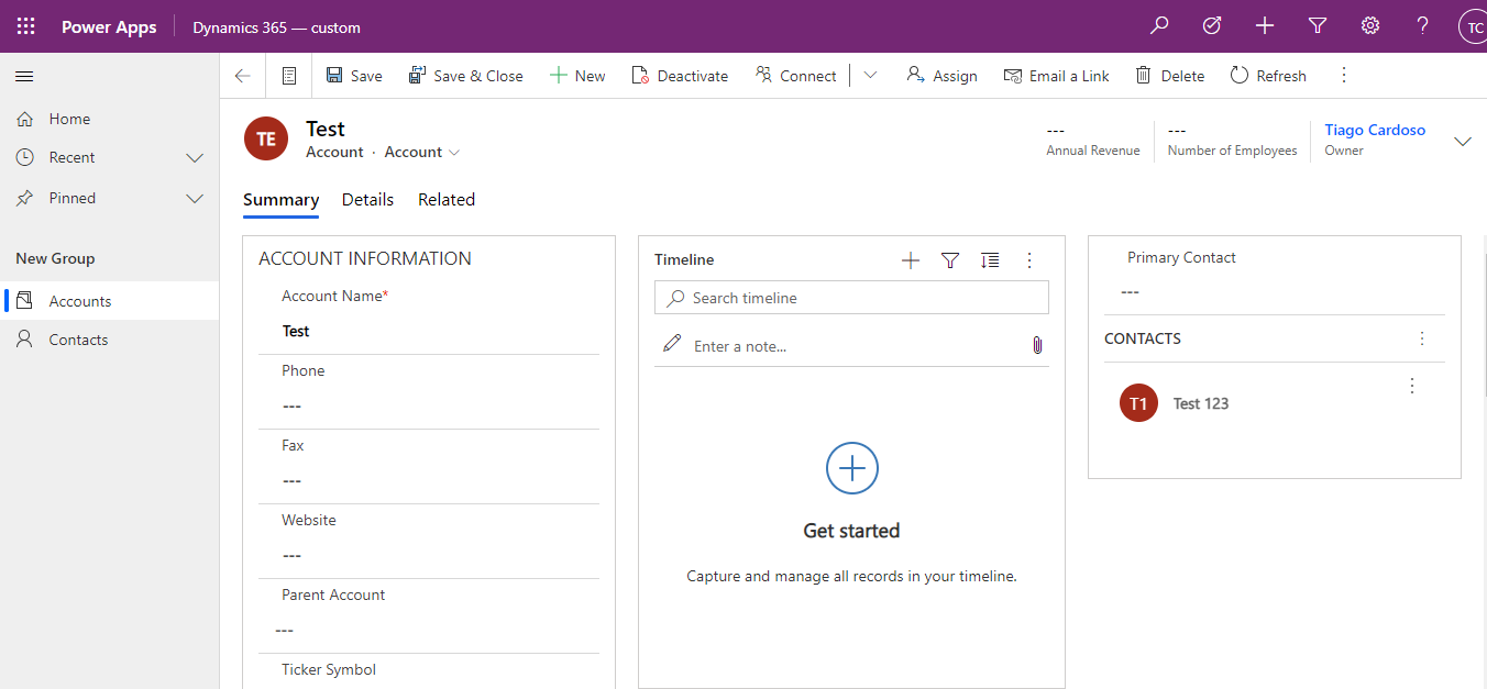 Ao criar um nova conta, podemos observar que o contato “Test 123″ foi criado, porém o plugin do contato não foi acionado, desta forma, a tarefa ” Task associated to the current contact” não foi criada!